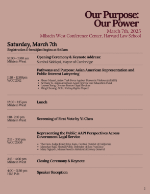 The Conference will take place in person at Harvard Law School on Saturday, March 7th. Our Conference theme this year is Our Purpose: Our Power. Harvard APALSA was founded as an organization dedicated to the political advancement of Asian American students on campus at a time when we were few. As the community has grown, this Conference calls for reflection on the ways in which AAPI professionals can assert their voices. What does it mean to show up, and on whose behalf do we do so? How do we represent ourselves both individually and collectively? We hope to inspire attendees to think about how they can strengthen their presence in legal, civic, and general leadership roles.