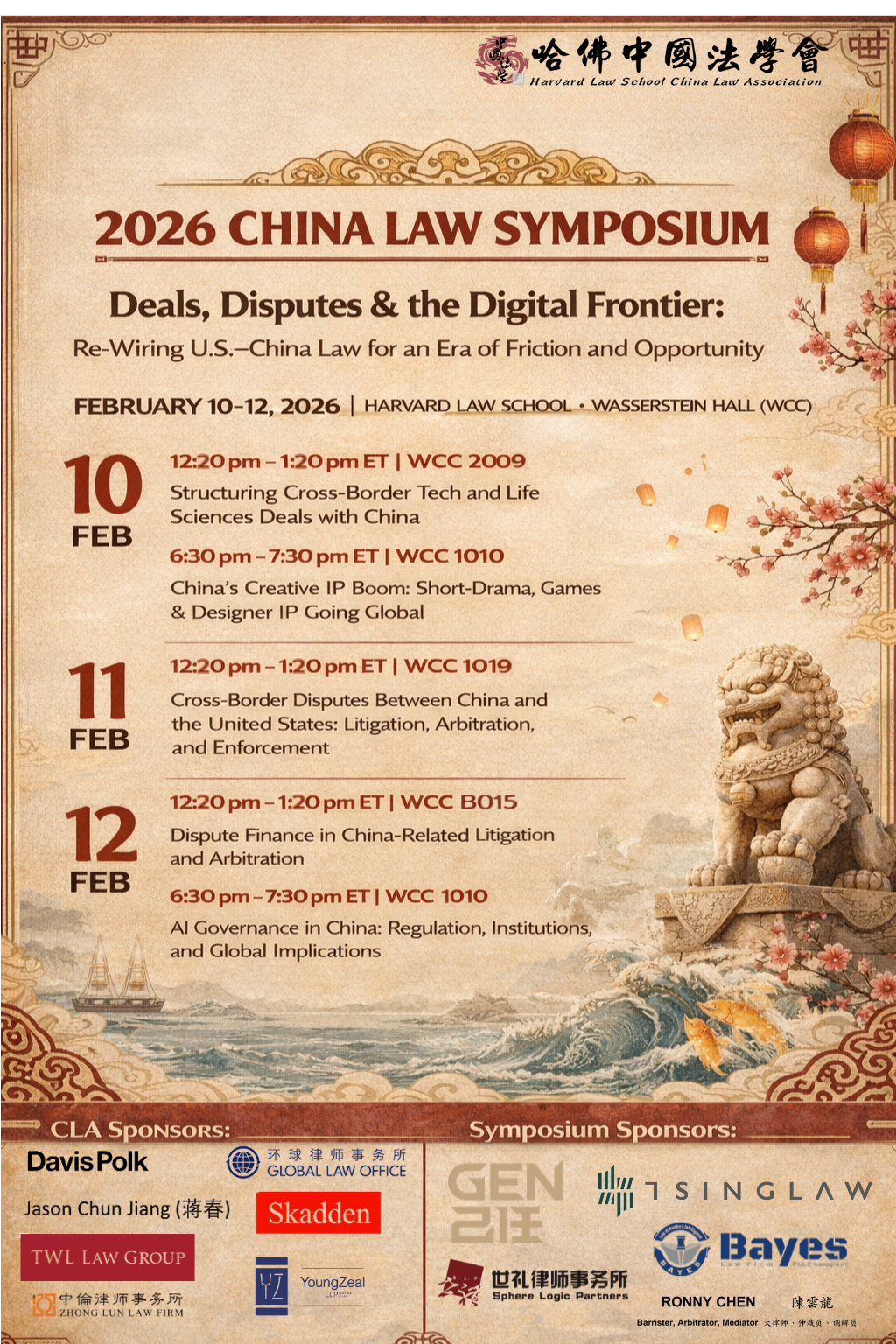 Join the Harvard Law School China Law Association for the 2026 China Law Symposium, a three-day event exploring the deals, disputes, and digital questions shaping U.S.-China law today. Food will be provided at all panels, and after the final panel on Thursday, February 12th, there will be a post-Symposium reception (details forthcoming). RSVP here.