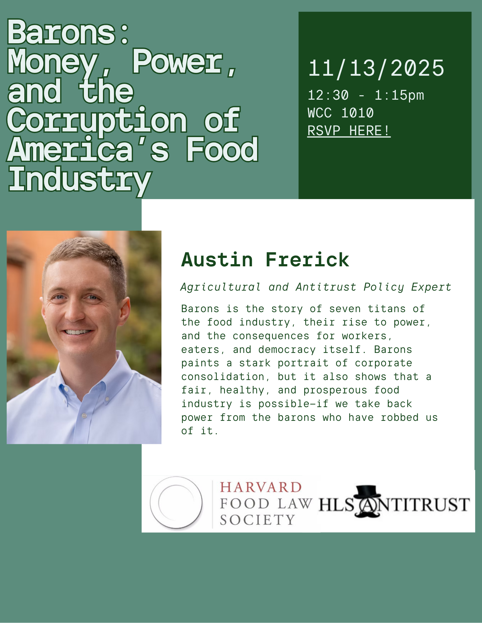 Join HLS FoodSoc and the Antitrust Association for a conversation with Austin Frerick, a policy expert in agriculture and antitrust. Austin will discuss his recent book, Barons: Money, Power, and the Corruption of America’s Food Industry, which profiles a series of powerful magnates to illustrate the concentration of power in the global food system.