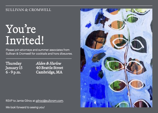 Sullivan & Cromwell is pleased to invite Harvard 1L students to join S&C lawyers and Summer Associates for our Harvard 1L reception at Alden & Harlow (40 Brattle Street, Cambridge, MA) on Thursday, January 15th at 6:00 PM ET. If you are available to join, please RSVP to Jamie Gilroy at [email protected] at your earliest convenience. We hope you join us!