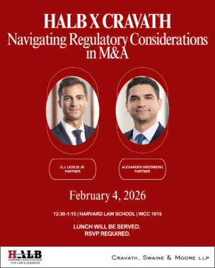 Join HALB for an exclusive conversation with Cravath, Swaine & Moore’s leading M&A attorneys as they highlight recent deals they have worked on and discuss navigating regulatory considerations in today’s deal environment. This session will offer a behind-the-scenes look at how high-stakes matters are resolved. Featured speakers will be G.J. Ligelis Jr. and Alexander Greenberg, corporate partners at Cravath with a focus on M&A. RSVP here.