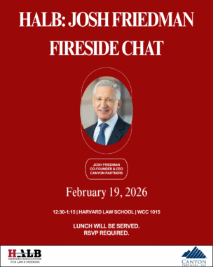 Josh Friedman is Co-Founder, Co-Chairman, and Co-Chief Executive Officer of Canyon Partners, LLC, and a graduate of Harvard College, Oxford University (Marshall Scholar), Harvard Business School, and Harvard Law School. This conversation will explore leadership, markets, and Mr. Friedman’s professional trajectory across law and finance. RSVP here.