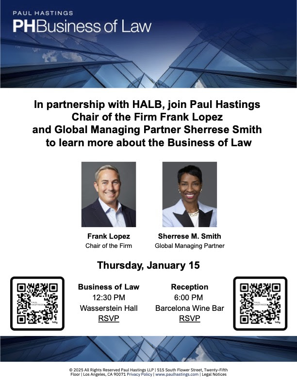 In partnership with HALB, join Paul Hastings Chair of the Firm Frank Lopez and Global Managing Partner Sherrese Smith to learn more about the Business of Law. Recently elected to a second term of leadership, Frank and Sherrese have led one of the most ambitious growth strategies in Big Law, making Paul Hastings one of the most acquisitive firms in the country. The firm’s revenue rose 9% and 22% during the first two full years of the leadership team’s first term as it opened new offices in Dallas and Boston. This session will cover the day-to-day realities of leading one of America’s most successful law firms, as well as the career moves that led to Frank and Sherrese’s successes. RSVP here.