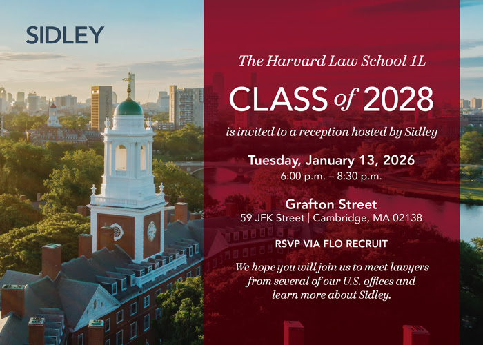 The Harvard Law School 1L Class of 2028 is invited to a reception hosted by Sidley. We hope you will join us to meet lawyers from several of our U.S. offices and learn more about Sidley. RSVP here.