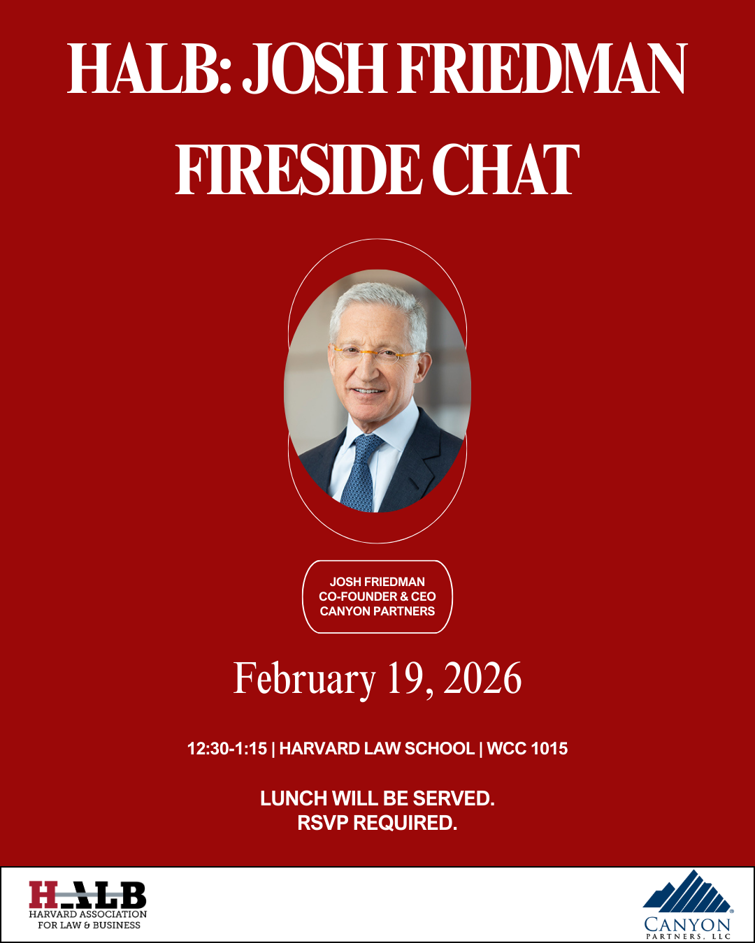 Josh Friedman is Co-Founder, Co-Chairman, and Co-Chief Executive Officer of Canyon Partners, LLC, and a graduate of Harvard College, Oxford University (Marshall Scholar), Harvard Business School, and Harvard Law School. This conversation will explore leadership, markets, and Mr. Friedman’s professional trajectory across law and finance. RSVP here.