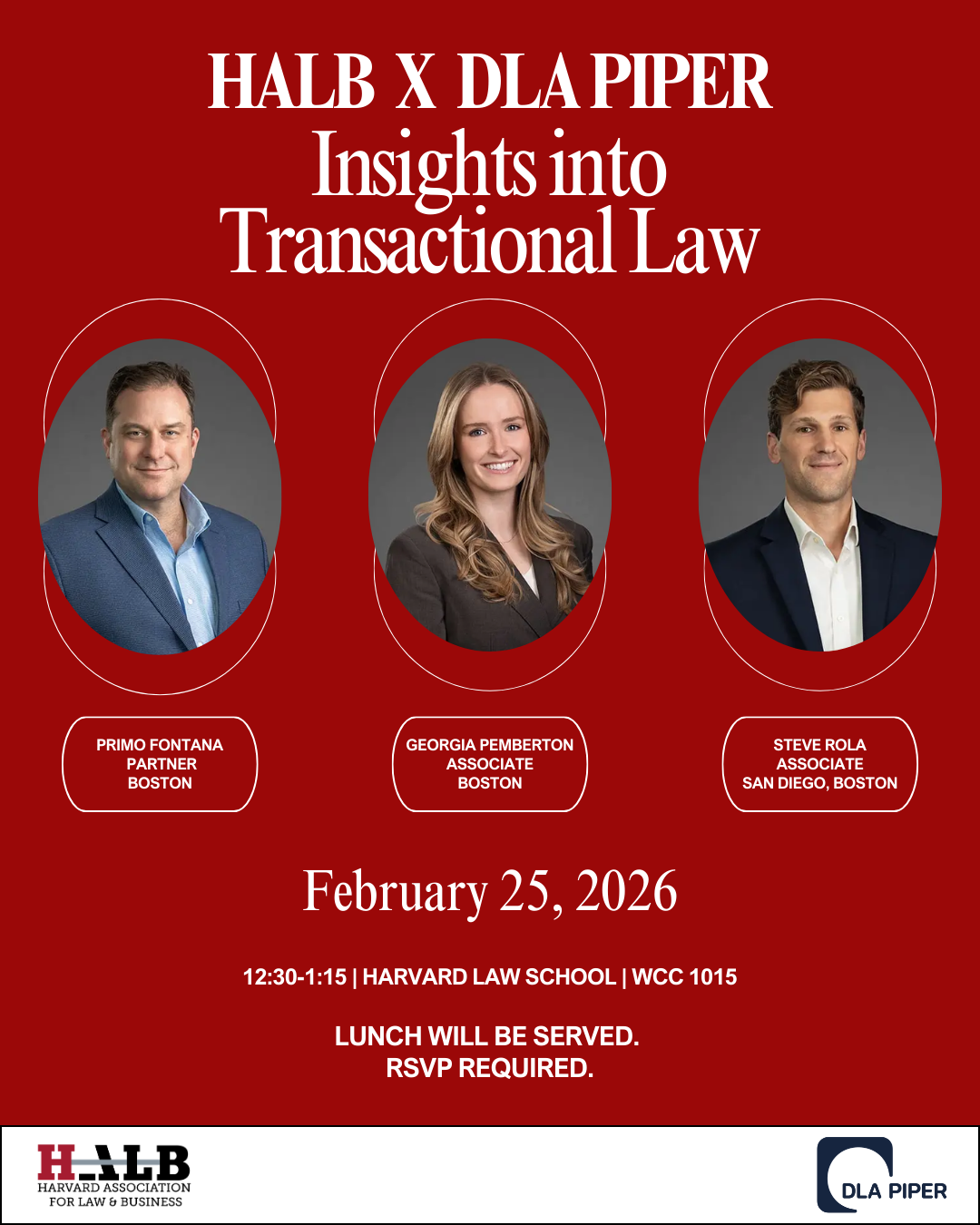Join HALB for a moderated panel discussion with attorneys from DLA Piper. This event offers students a unique opportunity to learn about the realities of life as a transactional lawyer at a leading global firm. The panel will feature Primo Fontana, Georgia Pemberton, and Steve Rola, who will share insights into their respective practices in Real Estate and Investment Funds. RSVP here.