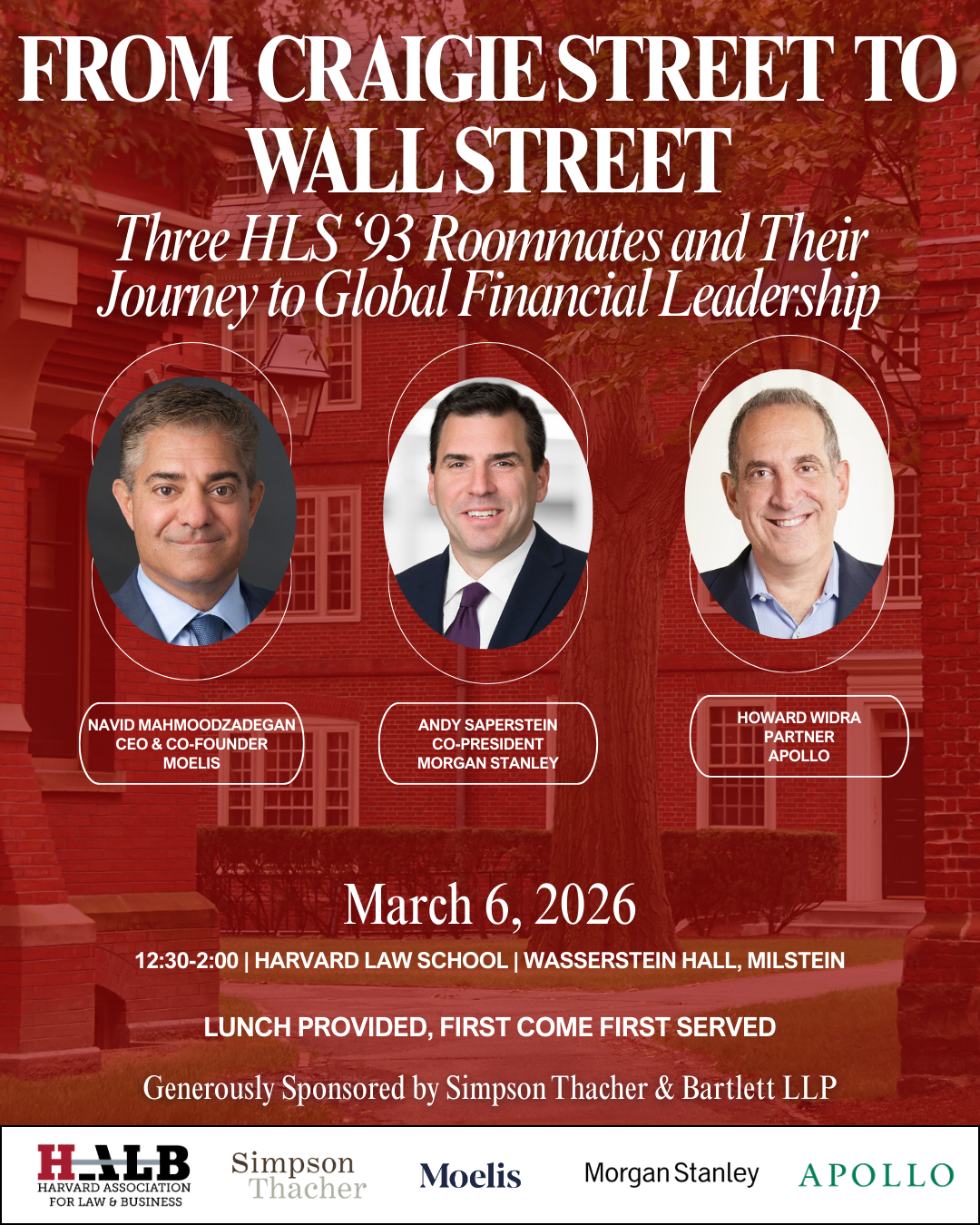 Join HALB for an exclusive conversation featuring three HLS’93 roommates who all became distinguished global leaders in financial services: Navid Mahmoodzadegan (CEO & Co-Founder of Moelis); Andy Saperstein (Co-President of Morgan Stanley); and Howard Widra (Partner at Apollo). The event will be moderated by their HLS’93 classmate Lori Lesser (Partner, Simpson Thacher & Bartlett LLP). Do not miss this rare opportunity to hear from three finance titans about their time at HLS, career strategies and advice for future finance executives and lawyers. RSVP here.