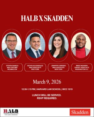 Join HALB for an exclusive conversation with Skadden’s leading M&A attorneys as they walk through their transactional experience. From the perspective of a partner to a junior associate, this event offers a unique opportunity to hear directly from attorneys working on live public transactions. Join to gain valuable insights into the strategies and thought processes behind resolving high-stakes matters. Featured speakers will be TBD. RSVP here.
